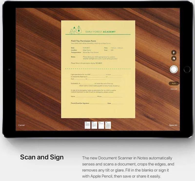 یکی از قابلیت‌های کاربردی iOS 11 اسکن مدارک و کاغذ‌ها به وسیله دوربین آیفون/آیپدتان است. برای انجام این کار کافی است وارد برنامه Note شوید و گزینه Documents Scanner را انتحاب کنید. پس از اسکن فایل مورد نظر می‌توانید بلافاصله تغییراتی را روی آن ایجاد کنید. به طور مثال می‌توانید یک فرم را اسکن کرده و سپس امضای خود را روی آن درج کنید و در صورت نیاز به اشتراک بگذارید.