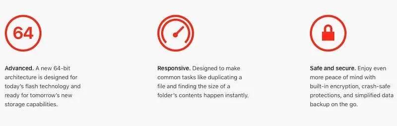 APFS فایل سیستم جدیدی است که توسط اپل توسعه داده شده و و با تمامی محصولات این شرکت از Apple Watch گرفته تا Mac Pro سازگار است. اپل فایل سیستم پس از گذشت ۱۹ سال جایگزین فایل سیستم‌قدیمی +HFS، که با نام Mac OS Extended نیز شناخته می‌شد، شده است. فایل سیستم +HFS از زمان فلاپی دیسک‌ها و درایوهای دیسک سخت (سال ۱۹۹۸ میلادی) تاکنون استفاده شده اما این روزها به کارگیری حافظه‌های SSD در بسیاری از محصولات فراگیر شده و فایل‌سیستم‌های قدیمی آن‌چنان برای این نوع درایو‌ها بهینه نیستند و از حداکثر قابلیت و سرعت آن‌ها استفاده نمی‌کنند. اما APFS این چنین نیست و به طور کامل برای ذخیره سازی حافظه‌های فلش بهینه شده است. نمایش وضعیت لحظه‌ای حافظه، سرعت و امنیت بالاتر، رمزگذاری قدرتمند، پشتیبانی کامل از سیستم‌های ۶۴ بیتی، استفاده پیشرفته و یکپارچه از پارتیشن‌ها و ده‌ها نکات دیگر از مزایای APFS است. همچنین اگر فایلی را کپی یا Duplicate کنید در کسری از ثانیه این کار انجام می‌شود و نکته جالب توجه این است که فقط اندازه یک فایل از فضای درایو اشغال می‌شود. پس از انتشار iOS 10.3 تمام آیفون‌و آیپد‌های تحت پشتیبانی این نسخه به صورت خودکار فایل سیستم‌شان به APFS تغییر پیدا کرده است و این روند پس از انتشار macOS 10.3 High Sierra روی تمام مک‌های تحت پشتیبانی این سیستم‌عامل تکرار خواهد شد. پیشرفت سرعت و تغییراتی که APFS در macOS ایجاد خواهد کرد برای تمام کاربران مک محسوس خواهد بود.