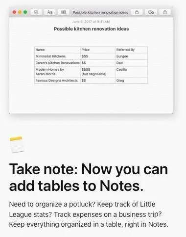 برنامه Note در High Sierra نیز از ایجاد جدول پشتیبانی می‌کند.