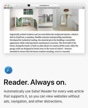 یکی از قابلیت‌های کاربردی و مفید سافاری Reader است. هنگامی که Reader را فعال کنید صفحات وب‌سایت درشت و خوانا‌تر می‌شود و هنگام مطالعه یک مطلب یا مقاله طولانی چشمان کاربر را خسته نمی‌کند. همچنین در محیط‌های تاریک و شب می‌توانید از پس‌زمینه مشکی یا زرد استفاده کنید که چشمانتان دیرتر خسته شود و مطالعه صفحات وب را برایتان لذت بخش‌تر می‌کند. در High Sierra می‌توانید از قابلیت را به صورت دائمی روشن کنید تا هر وب‌سایتی که از این قابلیت پشتیبانی می‌کند به صورت خودکار Redaer فعال شود.