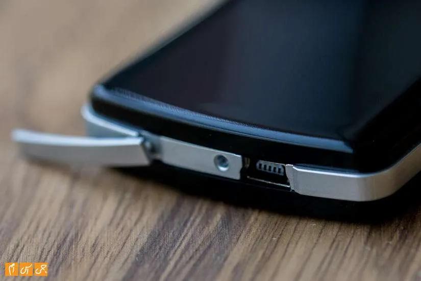 لبه سمت راست کلید پاور به همراه سوراخ ریست کردن دستگاه، بالای دستگاه آنتن، پایین درگاه ارتباطی برای شارژ شدن و سمت چپ هیچ گزینهای دیده نمیشود. قاب پشتی دستگاه کشویی است و با پایین کشیدن از جایش خارج میشود. با باز کردن درب قاب پشتی دسترسی به باتری امکانپذیر میشود. آنتن بهراحتی از جایش خارج میشود و با لولایی که برایش در نظر گرفتهشده میتوان جهت آن را بهدلخواه و برای دریافت بهتر سیگنال تنظیم کرد.