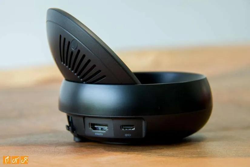گوشی فقط باید از طریق اتصال از درگاه تایپ سی خودش به این دستگاه متصل شود و خبری از اتصال بی‌سیم نیست. زمانی که گوشی روی دستگاه قرار بگیرد با توجه به اینکه دستگاه به برق متصل است هیچ نگرانی‌ای بابت شارژ گوشی وجود نخواهد داشت اما در کنار این مزیت چند عیب هم وجود دارد. اول اینکه با اتصال گوشی به داک دکس دیگر امکان استفاده از جک 3.5 میلی‌متری هدفون که در زیر گوشی قرار دارد نیست و دوم اینکه اسپیکر گوشی توسط دستگاه پوشانده می‌شود و نمی‌توان از نهایت ظرفیت اسپیکر استفاده کرد.