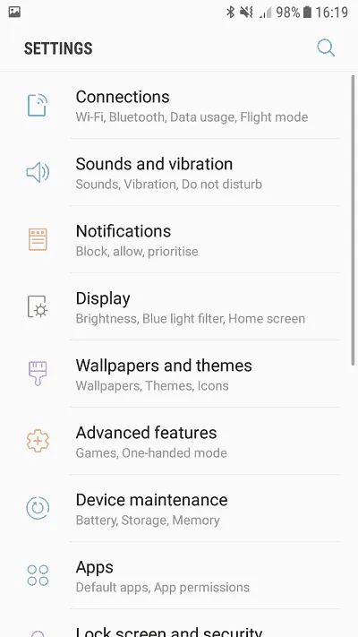 منوی تنظیمات طراحی جذاب و البته کاربردی‌ای دارد. در این بخش تنظیمات بسیار متنوعی دیده می‌شود که برخی از آن‌ها را توضیح می‌دهیم. اولین تنظیم که در اولین نگاه چشم را می‌گیرد تم است. با انتخاب این تنظیم بازار سامسونگ اپس برای عکس‌های پس زمینه، تم و آیکون باز می‌شود. برای دانلود و استفاده از این بخش باید یک اکانت در سامسونگ بسازید یا اینکه توسط حساب کاربری قبلی لاگین کنید. دنیایی بی‌نهایت از تم و والپیپر در این بازار وجود دارد که می‌توانید از دانلود و استفاده آن‌ها لذت ببرید.