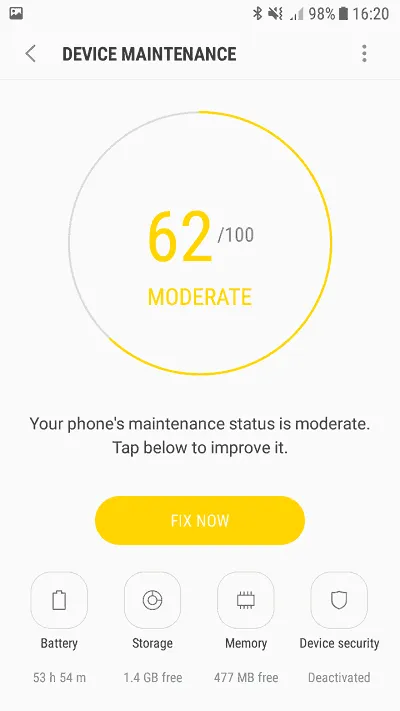 بخش مراقبت از گوشی در تنظیمات در نظر گرفته شده است. این قسمت از 4 بخش مجزا تشکیل شده که شامل باتری، حافظه داخلی، حافظه رم و امنیت است. با وارد شدن به این بخش گوشی هر 4 بخش را بررسی می‌کند و درنهایت با تجمیع باگ‌ها و ارورها به کاربر می‌گوید که وضعیت سلامتی دستگاه در چه سطحی است و با نمایش کلید Fix Now امکان را به کاربر می‌دهد تا وضعیت سلامتی گوشی را بهبود دهد.