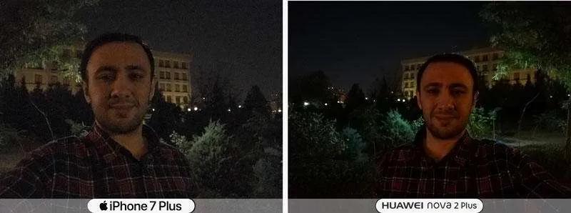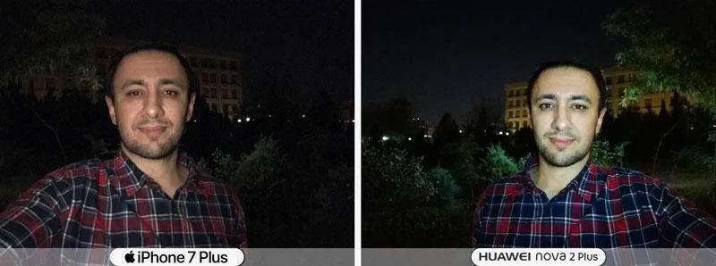 در بخش دوربین سلفی نوا ۲ پلاس مقابل آیفون ۷ پلاس قدرتنمایی میکند. دوربین نوا ۲ پلاس به سنسور ۲۰ مگاپیکسلی مجهز است در حالیکه رقیب گرانقیمتش یعنی آیفون ۷ پلاس به دوربین سلفی ۷ مگاپیکسلی مجهز است.