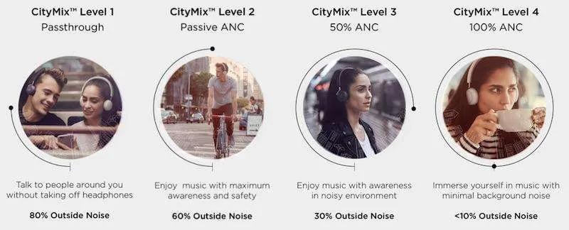 همانند هدفون تو گوشی Q ADAPT In-Ear، این هدفون نیز مجهز به قابلیت CityMix است که صدای مزاحم اطراف را کاهش میدهد. از نکات برجسته این هدفون میتوان به میزان کاهش نویز و صدای اطراف در ۴ مرحله اشاره کرد. هنگامی که CityMix در درجه اول قرار دارد ۸۰ درصد از صدای اطراف را به گوش کاربر منتقل میکند تا هنگامی که شما قصد داشته باشید با فردی صحبت کنید به راحتی متوجه صحبتهایش شوید. مرحله دوم ۶۰ درصد صدای اطراف را میشنوید و برای شرایطی مانند دوچرخه سواری که نیازمند توجه به محیط اطراف است، برایتان خطری ایجاد نمیکند. مرحله سوم ۳۰ درصد صدای اطراف را متوجه خواهید شد و در انتها هنگامی که CityMix در مرحله چهارم قرار دهید تنها کمتر از ۱۰ درصد صدا محیط اطراف را میشنوید.