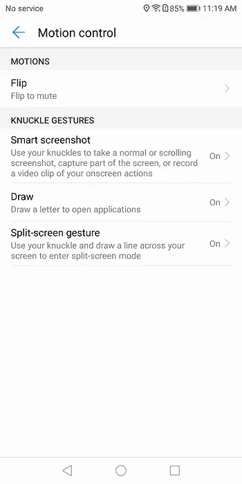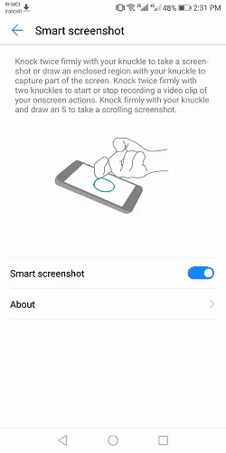 Smart Screenshot: با فعال شدن این تنظیم با دو بار ضربه زدن روی صفحه‌نمایش با بند انگشت می‌توانید از صفحه‌نمایش اسکرین شات بگیرید یا اینکه با ضربه زدن روی صفحه با بند انگشت و کشیدن یک شکل هندسی از آن قسمت از صفحه اسکرین شات بگیرید. با ضربه زدن دو بار صفحه‌نمایش با بند دو تا از انگشتانتان می‌توانید فیلم‌برداری از صفحه را فعال کنید.