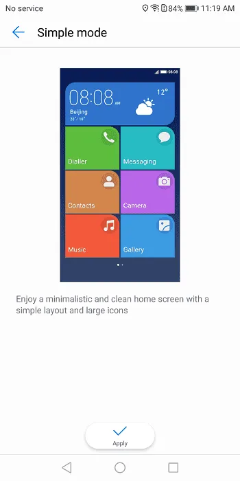 Simple Mode: اگر این تنظیم را انتخاب کنید منوی اصلی دستگاه کاملا تغییر می‌کند تا دسترسی‌ها آسان‌تر شود.