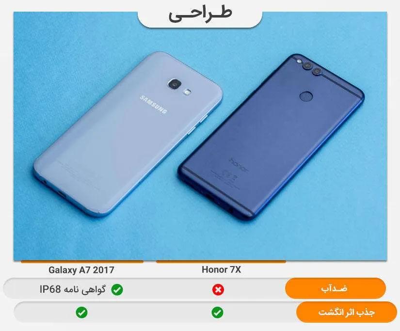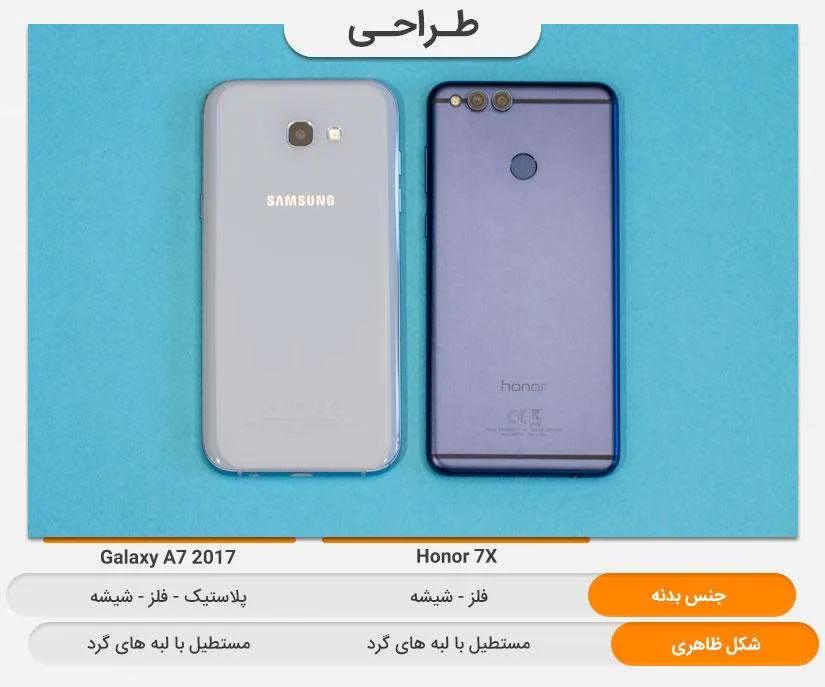 قاب پشتی آنر ۷ ایکس با این که از جنس فلز ساخته شده اما به راحتی همانند گوشیهایی که دارای قاب پشت شیشهای هستند اثر انگشت را به خود جذب میکند! البته از نظر خط و خش گرفتن دوام بسیار بیشتری نسبت به گلکسی ای ۷ (۲۰۱۷) دارد. قاب پشتی گلکسی ای ۷ (۲۰۱۷) پلاستیکی است اما به راحتی گوشیهای که دارای قاب پشتی شیشهای هستند، در صورت عدم استفاده از قاب ظرف گذشت تنها چند روز خط و خشهای فراوانی روی آن پدیدار میشود درصورتی که آنر ۷ ایکس این چنین نیست.