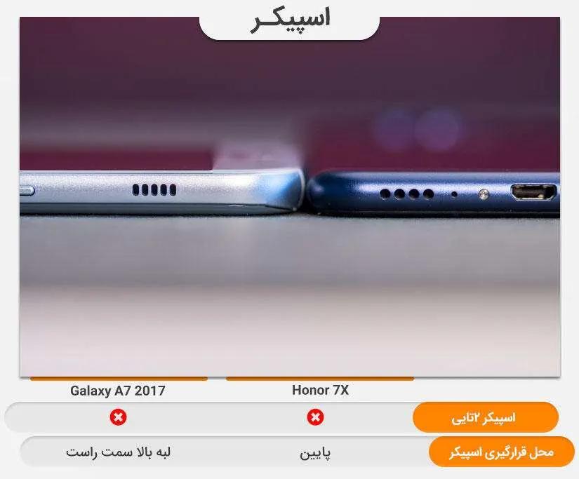 هر دو گوشی فاقد اسپیکر دوتایی (استریو) هستند. میزان خروجی صدا در هر دو گوشی تقریبا یکسان است اما آنر ۷ ایکس به مراتب وضوح صدا و کیفیت بهتری نصبت به رقیب خود دارد. اسپیکر آنر ۷ ایکس مانند بسیاری از گوشیها در قسمت پایین گوشی قرار دارد اما محل قرار گیری اسپیکر گلکسی ای ۷ (۲۰۱۷) کمی متفاوت است. اسپیکر گلکسی ای ۷ (۲۰۱۷) بالای دکمه پاور قرار گرفته است در کناره یکی از مزیتهای محل قرارگیری اسپیکر گلکسی ای ۷ (۲۰۱۷) این است که هنگام کارکرن با گوشی در حالت افقی همانند بازی کردن دستتان مانع خروجی صدا نمیشود. در مجموع از نظر کیفیت صدای اسپیکر آنر ۷ ایکس با کمی اختلاف امتیاز بیشتری را از آن خود میکند.