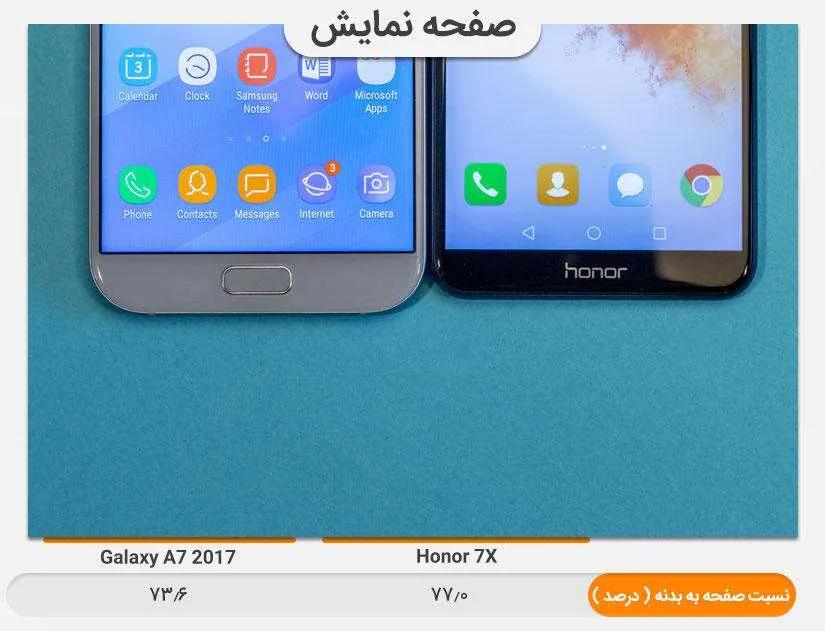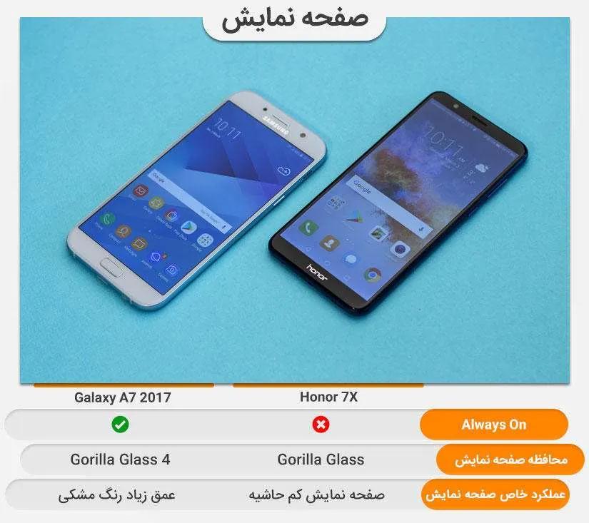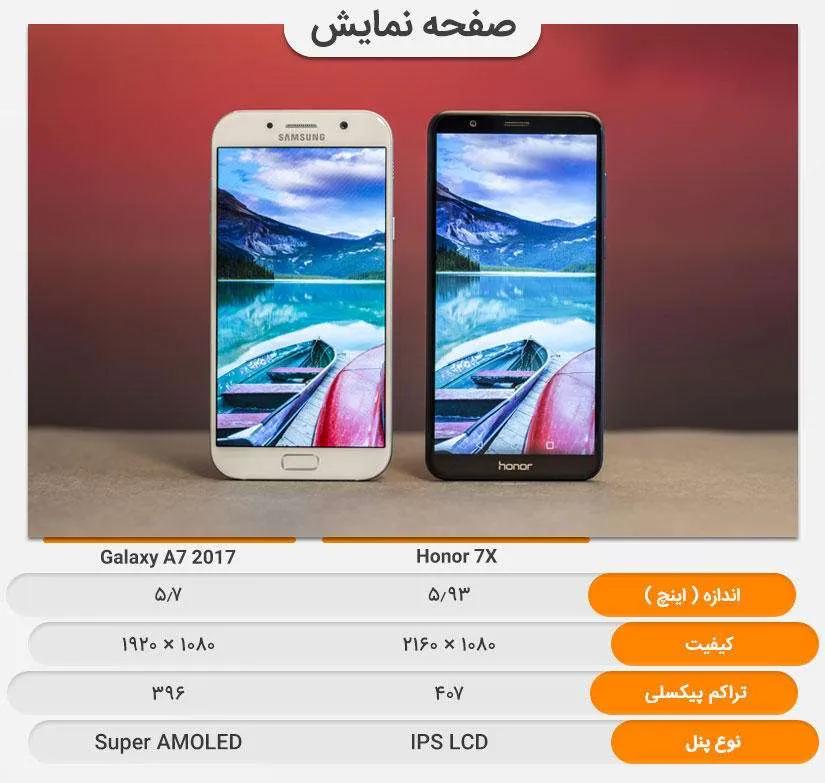 صفحهنمایش یکی از مهمترین از بخشهای گوشی است. همانند بسیاری از گوشیهای سامسونگ، گلکسی ای ۷ (۲۰۱۷) صفحهنمایشی از نوع Super AMOLED دارد. اندازه صفحه نمایش گلکسی ای ۷ (۲۰۱۷)، ۵.۷ اینچ، رزولوشن ۱۰۸۰x۱۹۲۰ و نسبت ابعاد ۱۶:۹ است. صفحهنمایش آنر ۷ ایکس از نوع IPS LCD با اندازه بزرگتر و حاشیه اطراف کمتر نسبت به رقیباش است. اندازه صفحهنمایش آنر ایکس ۵.۹۳ اینچ، رزولوشن ۱۰۸۰x۲۱۶۰ و نسبت ابعاد ۱۸:۹ است. تراکم پیکسل صفحهنمایش گلکسی ای ۷ (۲۰۱۷) و آنر ۷ ایکس به ترتیب ۳۸۶ و ۴۰۷ پیکسل است. با این که آنر ۷ ایکس تراکم پیکسل بالاتری نسبت به گلکسی ای ۷ (۲۰۱۷) دارد اما تفاوت آنها به هیچ عنوان محسوس نیست.