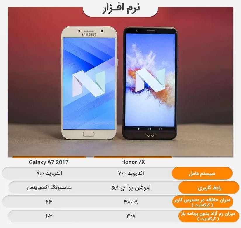 گلکسی ای ۷ (۲۰۱۷) با اندروید ۶.۰.۱ مارشمالو فروخته میشود که بلافاصله پس از باز کردن جعبه میتوانید به اندروید ۷ آپدیت کنید. اما آنر ۷ چون گوشی جدیدتری نسبت به (A7 (2017 است از همان ابتدا با اندروید ۷ نوقا روانه بازار شده. رابط کاربری گلکسی ای ۷ (۲۰۱۷) پس از به روز رسانی به اندروید ۷ نوقا، تبدیل به Samsung Experience 8.1 میشود است که آیکون و شکل و شمایل پختهتری نسبت به EMUI 5.1، رابط کاربری آنر ۷ ایکس دارد. اما EMUI 5.1 ترفندها و قابلیتهای ریز و پنهان بیشتری درون خود جای داده است که طی استفاده روزمره کار با گوشی را راحتتر میکند. به طور مثال در برنامهای مانند Settings هنگامی که میخواهید به صفحه قبلی برگردید با کشیدن انگشتتان از گوشه سمت چپ صفحه نمایش منوی کامل تنظیمات به شکل پنجرهای کوچک نمایش داده میشود که کاربر راحتتر میتواند به بخشهای دیگر مراجعه کند.