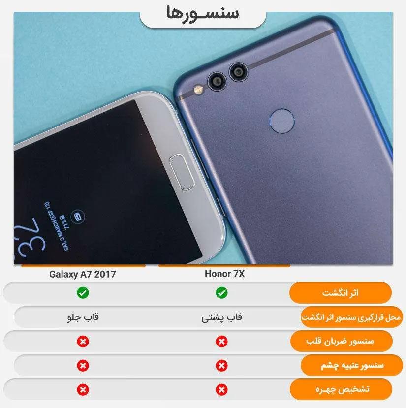 سنسور اثر انگشت در گلکسی ای ۷ (۲۰۱۷) زیر دکمه خانه در قسمت پایین صفحهنمایش قرار دارد اما آنر ۷ ایکس به دلیل کاهش حاشیه اطراف صفحهنمایش به قاب پشتی منتقل شده. طبیعتا باز کردن گوشی با حسگر اثر انگشتی که در قاب جلو گوشی قرار دارد به مراتب راحتتر است اما کاربران آنر ۷ ایکس لازم نیست نگران این موضوع باشند چرا که با گذشت چند روز به این مسئله عادت خواهند کرد. البته بسیاری از افراد محل قرار گیری حسگر اثر انگشت در قاب پشتی را راحتتر میدانند.