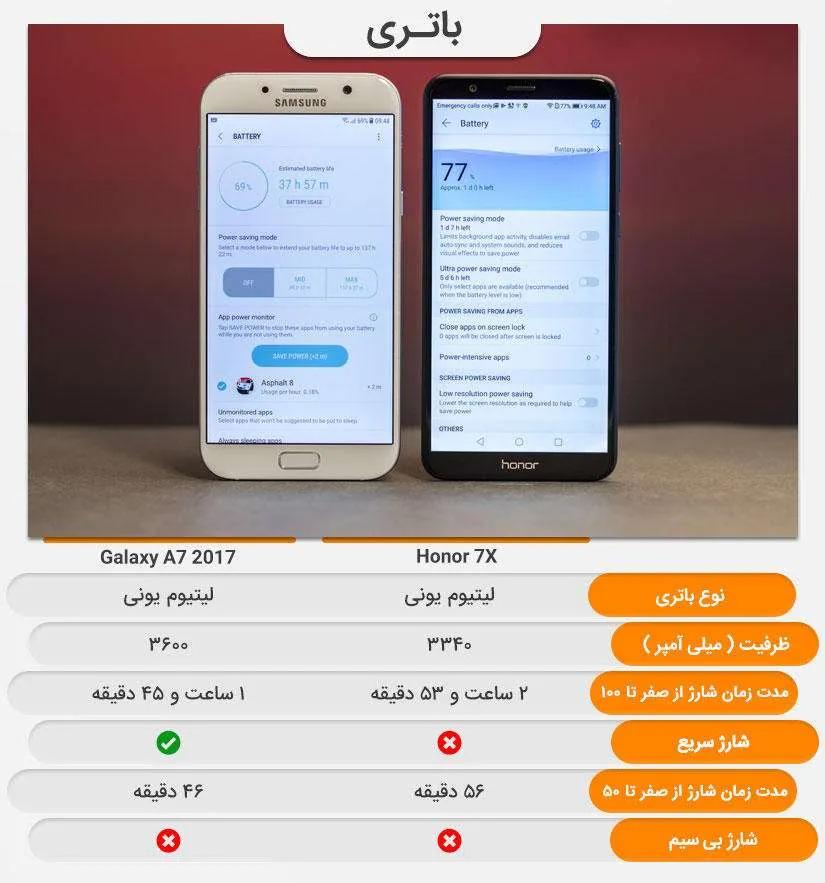 گلکسی ای ۷ (۲۰۱۷) با توجه به عرض و ضخامت بیشتری که نسبت به آنر ۷ ایکس دارد از ظرفیت باتری بیشتری بهرهمند است. باتری آنر ۷ ایکس از نوع لیتیوم یونی با ظرفیت ۳،۳۴۰ میلیآمپر است و گلکسی ای ۷ (۲۰۱۷) همانند آنر ۷ ایکس باتری لیتیومی دارد با ظرفیت ۳،۶۰۰ میلیآمپر. گلکسی ای ۷ (۲۰۱۷) مجهز به شارژ سریع است قابلیتی که در انر ۷ ایکس وجود ندارد. شارژ باتری گلکسی ای ۷ (۲۰۱۷) از ۰ تا ۱۰۰ درصد حدود ۱ ساعت و ۴۵ دقیقه زمان میبرد. این در حالی است که برای شارژ کامل آنر ایکس باید حدود ۲ ساعت و ۵۴ دقیقه صبر کنید. مدت زمان شارژ ۰ تا ۵۰ درصد در آنر ۷ ایکس ۵۶ دقیقه و گلکسی ای ۷ (۲۰۱۷) حدود ۴۶ دقیقه است. برنده این بخش بیشک گلکسی ای ۷ (۲۰۱۷) است. عملکرد فوقالعاده باتری این گوشی باعث شده تا معروف به یکی از با دوامترین گوشیهای هوشمند طی سالهای اخیر بشود. البته هر دو گوشی به صورت نرمافزاری قابلیت صرفه جویی انرژی در دو مرحله را دارند. کاربران میتوانند در با استفاده از این قابلیت طول عمر باطری گوشی هوشمندشان را افزایش دهد.