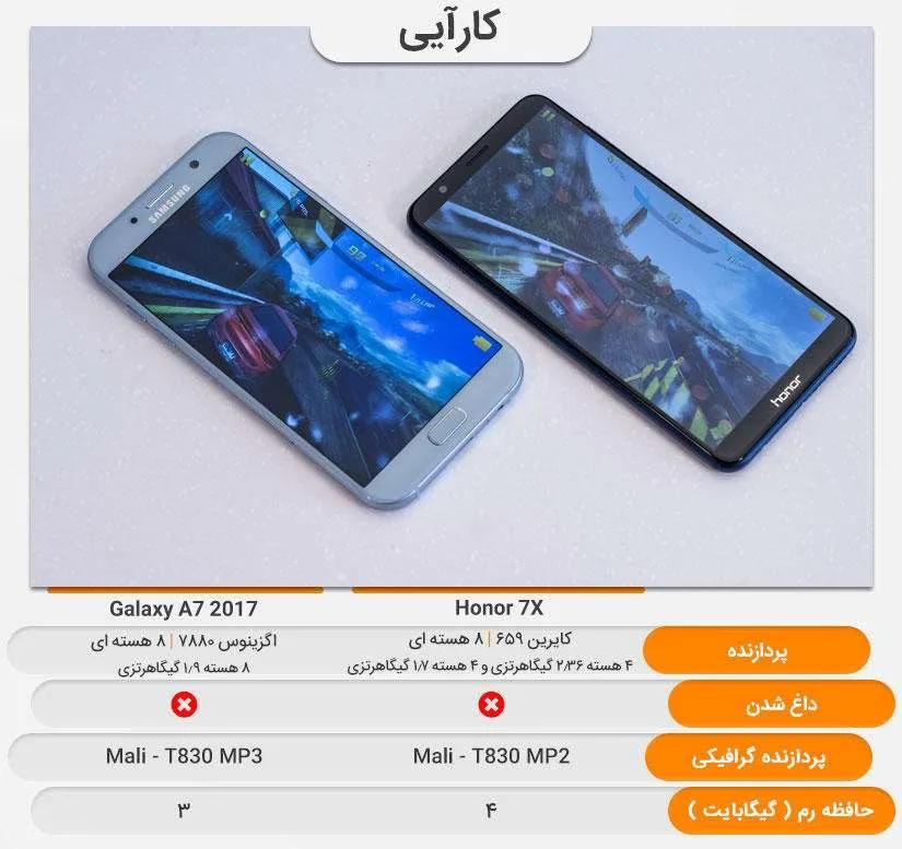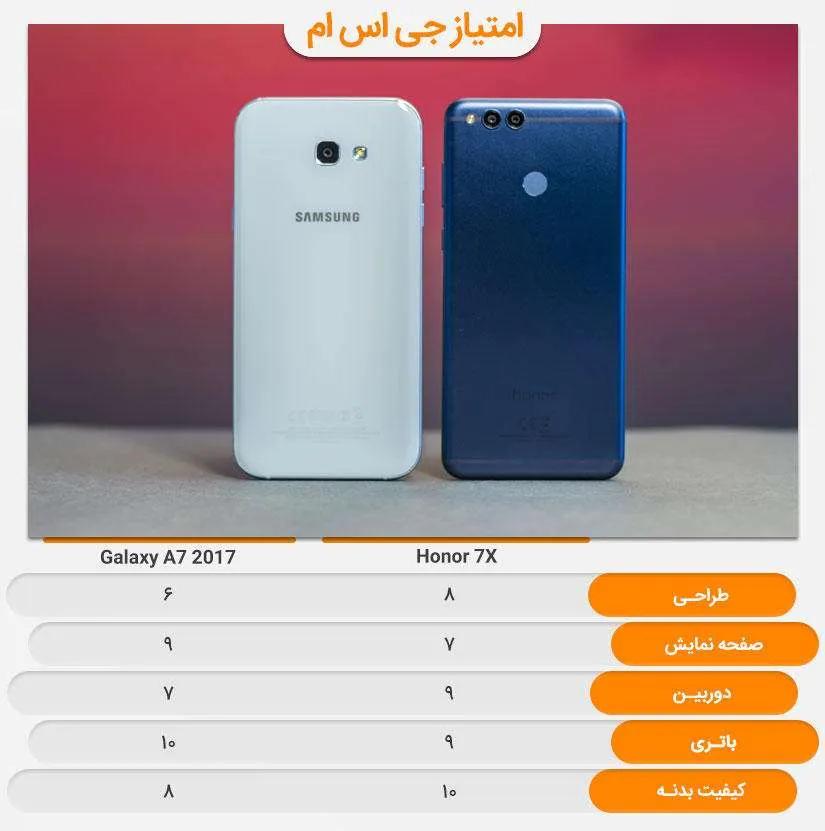 گلکسی ای ۷ (۲۰۱۷) طول عمر باتری شگفت انگیز و صفحهنمایش با کیفیت بالایی دارد. امکان نصب و استفاده همزمان دو سیم کارت و حافظه جانبی Micro SD از ویژگی های برتر این گوشی است. اما به جز موارد ذکر شده آنر ۷ ایکس از همه نظر بهتر است. کیفیت هر دو دوربین اصلی و سلفی آنر ۷ ایکس به وضوح برتری خود را نسبت به رقبیش گلکسی ای ۷ (۲۰۱۷) نشان میدهد. حاشیه کمتر اطراف صفحهنمایش، بدنه مقاوم و خوش دست بودن آنر ۷ ایکس و همچنین سختافزار قویتر نسبت به گلکسی ای ۷ (۲۰۱۷) سامسونگ از جمله مواردی است که نمیتوان از آن چشم پوشی کرد. در ضمن آنر ۷ ایکس از قیمت کمتری برخوردار است و گوشی مقرون به صرفهتری محسوب میشود.