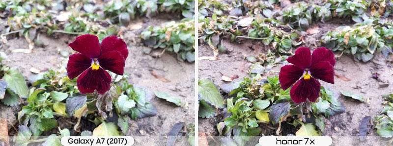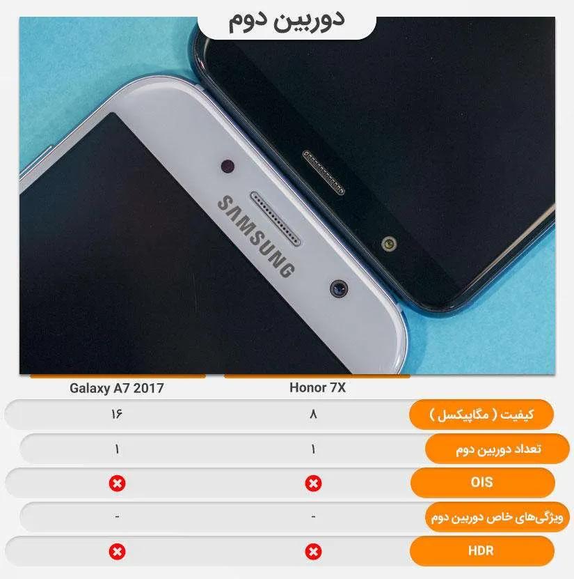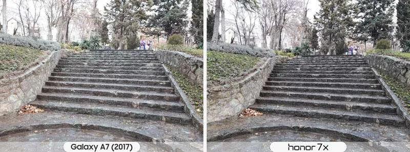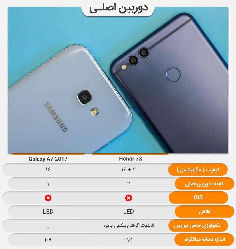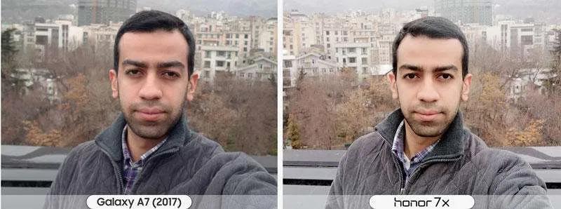 یکی از اولین مواردی که اغلب کاربران پس از خرید گوشیشان بلافاصله تست میکنند دوربین است. دوربین اصلی گلکسی ای ۷ (۲۰۱۷) مجهز به یک لنز ۱۶ مگاپیکسلی با اندازه دریچه دیافراگم f/1.9 است. در کنار آن آنر ۷ ایکس مجهز به دوربین با لنز دوگانه است. یکی از لنزها همانند گلکسی ای ۷ (۲۰۱۷) ۱۶ مگاپیکسلی و دیگری ۲ مگاپیکسل است که برای عکسبرداری در حالت پرتره تعبیه شده است. هنگام عکسبرداری پرتره آنر ۷ ایکس برنده بازی است. اما در حالت عکسبرداری عادی گلکسی ای ۷ (۲۰۱۷) جزییات بیشتری را به ثبت میرساند. در موقیعتهای کم نور مانند شب یا محیطهای نسبتا تاریک به صراحت میتوان عکسهای آنر ۷ ایکس کنتراست بالاتری دارند و تصاویر روشنتری را ثبت می کند اما همین دلیل باعث پدیدار شدن نویزهای زیاد (دون دون شدن عکس) میشود. دوربین سلفی گلکسی ای ۷ (۲۰۱۷) و آنر ۷ ایکس به ترتیب ۱۶ و ۸ مگاپیکسل است. احتمال با خودتان فکر میکنید دوربین سلفی گلکسی ای ۷ (۲۰۱۷) تصاویر بهتری را ثبت میکند اما چنین نیست. دوربین جلوی آنر ۷ ایکس با این که رزولوشن کمتری دارد اما عکسهای روشنتر و با نویز کمتری به ثبت میرساند. دوربین سلفی آنر ۷ ایکس قابلیت عکس برداری در حالت پرتره را نیز دارد اما در گلکسی ای ۷ (۲۰۱۷) شاهد این ویژگی نیستیم. دوربین سلفی هر دو گوشی توان ضبط ویدئو با کیفیت فول اچدی 1080p را دارند که تقریبا با کیفیت یکسانی فیلمبرداری میکنند.