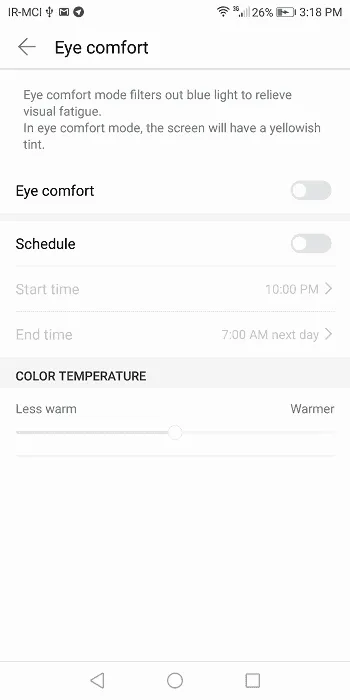 Eye Comfort: حتما با این ویژگی آشنا هستید. با فعال کردن این تنظیم پیکسل‌های آبی خاموش یا حداقل کم‌نور می‌شوند و نور پیکسل‌های زرد روی صفحه غالب می‌شود. این قابلیت برای زمانی مناسب است که در محیط تاریک مشغول کار کردن با گوشی باشید. مانند بسیاری از گوشی‌های هوشمند امکان زمان‌بندی دادن به این ویژگی و کم‌وزیاد کردن شدت روشنایی وجود دارد.