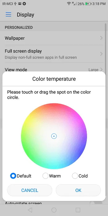 Color temperature: در این بخش سه تنظیم برای نمایش رنگ‌ها و شدت گرمای آن‌ها وجود دارد. اولین تنظیم، تنظیم پیش‌فرض است. دومین تنظیم گرم و سوم تنظیم سرد و درنهایت امکان تنظیم دستی با جا به جایی و حرکت بین رنگ‌ها توسط کاربر وجود دارد.