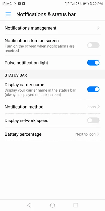 Notification & Status bar: در این بخش می‌توان نمایش نوتیفیکیشن ها را مدیریت کرد یا اینکه می‌توان در بخش نوار ابزار نمایش بعضی جزئیات مانند سرعت شبکه، درصد باتری یا نوع نمایش نوتیفیکیشن ها را تعیین کرد.