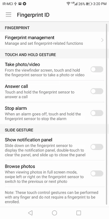 Fingerprint ID: در این بخش تنظیمات مربوط به سنسور اثرانگشت گنجانده شده است. علاوه بر تعریف و حذف یک یا چند اثرانگشت می‌توان در این بخش تنظیمات سنسور را به‌گونه‌ای انتخاب کرد که بتوان از آن برای کارهای دیگری مانند عکس گرفتن، نمایش نوتیفیکیشن بار، پاسخ به تماس‌ها و مرور در گالری استفاده کرد.
