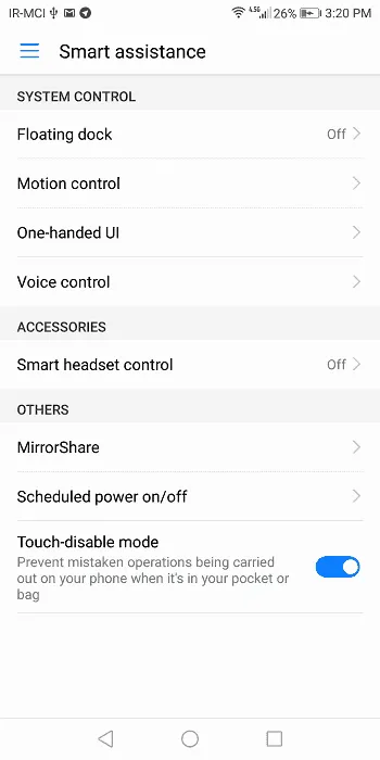 Smart assistance: در این بخش تنظیمات تعاملی با گوشی گنجانده شده است. به‌عنوان‌مثال می‌توان تنظیم کرد تا با برگرداندن گوشی در هنگام زنگ خوردن گوشی سایلنت شود یا اینکه با دوبار ضربه زدن روی صفحه‌نمایش صفحه خاموش یا روشن شود. علاوه بر این تنظیم ویژگی‌ای مانند MirrorShare که امکان نمایش محتوای در حال پخش روی صفحه را در صفحه‌ای بزرگ‌تر می‌دهد هم در این قسمت وجود دارد.