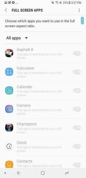Full Screen App گزینه دیگری است که مختص به گوشیهایی با صفحهنمایشهای بلندقد و نسبت ابعاد نامتعارف است. در این تنظیم میتوان برنامههای نصب شده روی گوشی را مجبور کرد تا به صورت تمام صفحه به نمایش در بیایند یا اینکه به همان صورت عادی با حاشیه مشکی در پایین صفحه به نمایش گذاشته شوند.