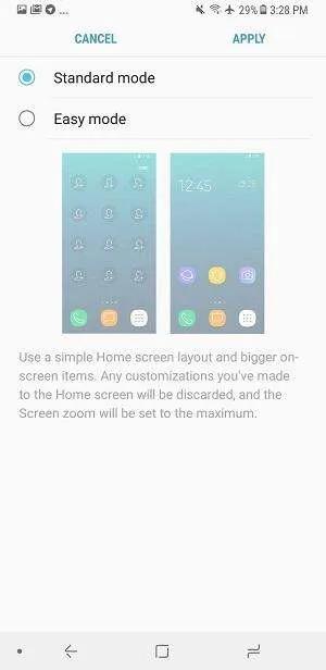 Easy Mode حالتی کاربردی برای کسانی است که انتظار زیادی از گوشی هوشمندشان ندارند که بیشتر افرادی با سن و سال بالا را شامل میشود. با انتخاب این حالت همه چیز روی صفحه بزرگ میشود و یک صفحه به صفحه اصلی اضافه میشود که امکان قرار دادن مخاطبان را به کاربر میدهد.