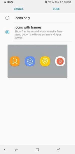 Icon frames دو حالت نمایش برای آیکونها را به کاربر میدهد. در حالت اول آیکونها به هر صورتی که توسعه دهنده برنامه آنها را طراحی کرده باشد نمایش داده میشوند و در حالت دوم تمام آیکونها در یک قاب دایرهای قرار میگیرند که باعث نظم بخشیدن به ظاهر گوشی میشود.