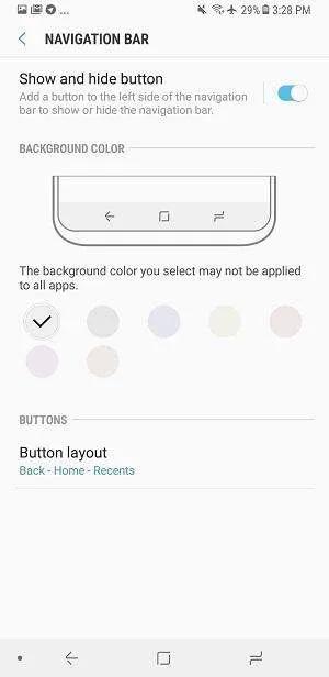 Navigation bar امکان شخصیسازی کلیدهای ناوبری پایین صفحهنمایش را برای کاربر فراهم میکند. در این تنظیم علاوه بر اینکه میتوان چیدمان این کلیدها را در دو حالت تعیین کرد امکان تغییر رنگ پسزمینه آنها هم وجود دارد.