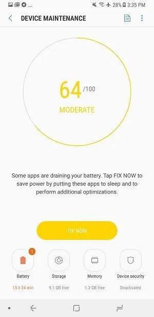 Device Maintenance ابزاری است که باتری، حافظه داخلی، حافظه رم و امنیت دستگاه را بررسی میکند در یک میانگین کلی به شما میگوید که وضعیت گوشی چگونه است. امکان بهینه کردن وضعیت گوشی تنها با لمس یک کلید امکانپذیر است.