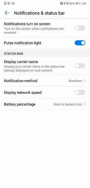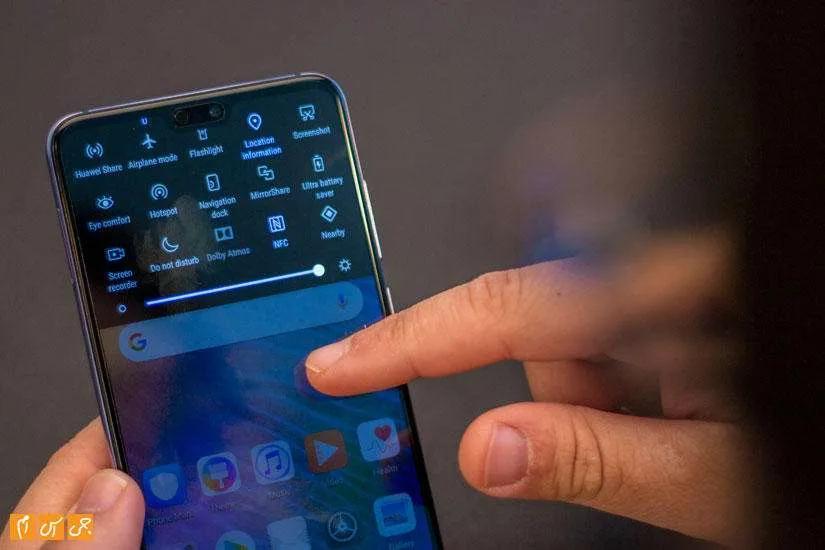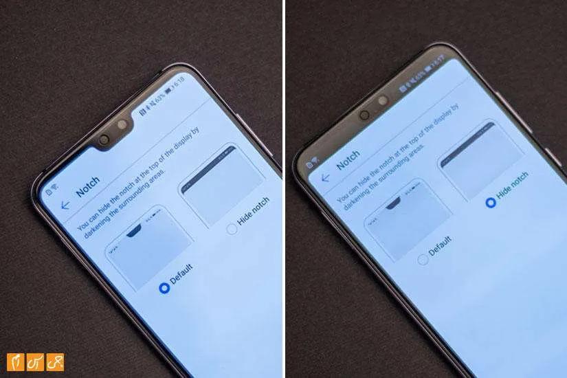 Notch: همانطور که گفتیم بالای صفحهنمایش نواری باریک و کوچک به نام ناچ قرار دارد که دوربین سلفی و سنسورها را در خودش جای داده است. اگر با این نوار مشکل دارید و هنگام کار کردن با صفحهنمایش دائم جلوی چشمان شما است هوآوی در این نسخه از اموشن یو آی این امکان را برای شما فراهم کرده است تا آن را مخفی کنید. اگر گزینه Hide Notch را در این تنظیم انتخاب کنید رنگی مشکلی دو طرف ناچ را بالای صفحهنمایش پر میکند. با مشکی شدن این دو قسمت دیگر ناچ به چشم نمیآید اما هنوز نوتیفیکیشن ها و ساعت و باتری در آن نمایش داده میشوند.