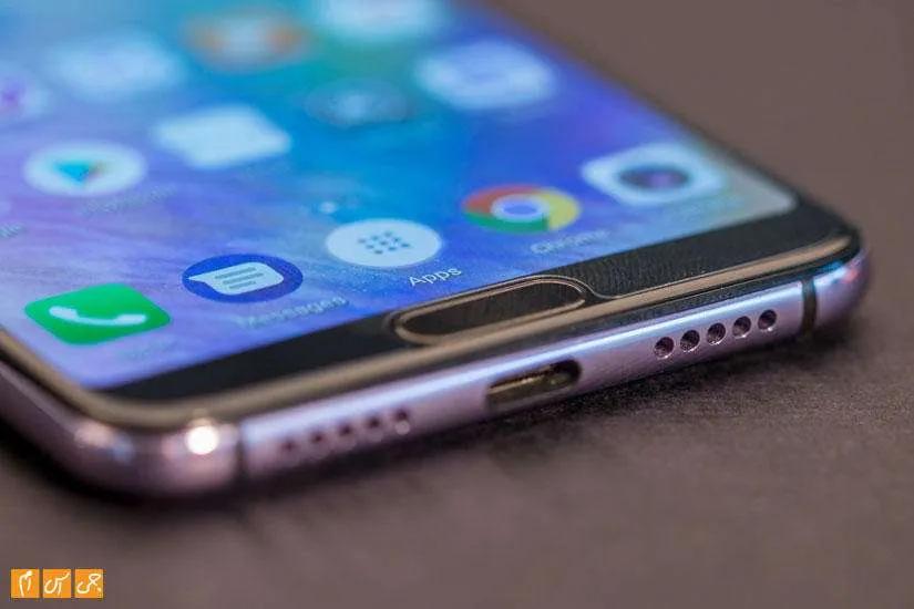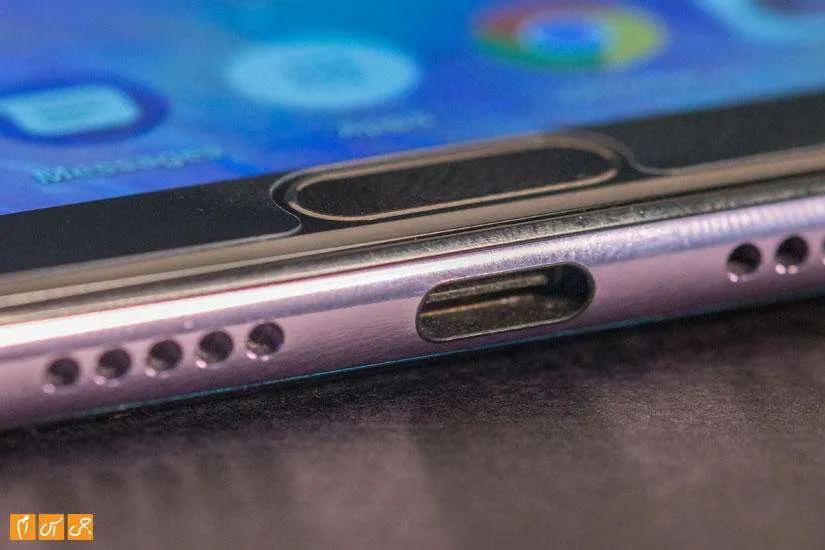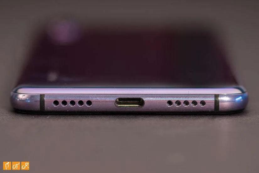 پایین گوشی درگاه ارتباطی تایپ سی میان دو ردیف سوراخ قرار دارد که زیر یکی از آنها اسپیکر و زیر دیگری میکروفون اصلی دستگاه قرار دارد.