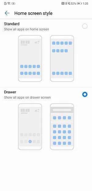 Home Screen Style: در این تنظیم امکان نمایش دو حالت مختلف برای صفحه اصلی وجود دارد. در حالت اول تمام برنامههای نصب شده روی گوشی در صفحه اصلی نمایش داده میشوند که هوآوی از ابتدا با این حالت صفحهنمایش گوشیهای هوشمندش را عرضه کرده بود. در حالت دوم یک کلید به کلیدهای پایین صفحهنمایش اضافه میشود که با لمس آن صفحهای به نام اپ دراور باز میشود. در این حالت برنامههای نصب شده روی گوشی در این صفحه به نمایش در میآیند و میتوانید از صفحه اصلی تنها برای ویجت ها یا برنامههای پر کاربرد استفاده کنید.