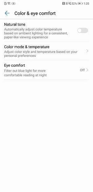 Color & eye comfort: در این تنظیم سه تنظیم قرار دارد. اولین گزینه Natural tone است. با فعال کردن این تنظیم گوشی شما بهصورت خودکار و بر اساس دیتاهایی که از سنسور نور دریافت میکند گرمای رنگها را به بهترین شکل ممکن تنظیم میکند.