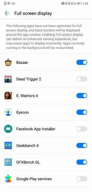 Full Screen Display: صفحهنمایش این گوشی مانند تمام گوشیهایی که به صفحهنمایشهای تمام صفحه مجهز شدهاند اندازه طبیعی ندارد و به همین سبب برخی برنامهها روی آنها بهدرستی نمایش داده نمیشوند. در این تنظیم برنامههایی به شما نشان داده میشود که با اندازه صفحه این گوشی تناسب ندارند و با استفاده از آنها نواری سیاه بالا و پایین آنها مشاهده میشود. از همینجا میتوانید آن برنامه را مجبور کنید تا بهصورت تمام صفحهنمایش داده شود.
