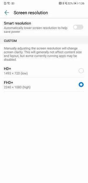 Screen Resolutoin: در این تنظیم امکان این وجود تا از دو کیفیت برای نمایش محتوا روی صفحهنمایش استفاده کنید. حالت HD+ که محتوا را در کیفیت پایین نمایش میدهد و حالت FHD+ که محتوا را در باکیفیتترین حالت نمایش میدهد. علاوه بر این در این تنظیم گزینهای وجود دارد به نام رزولوشن هوشمند که با فعال کردن آن زمانی که نیاز باشد باتری ذخیره شود کیفیت را پایین میآورد.