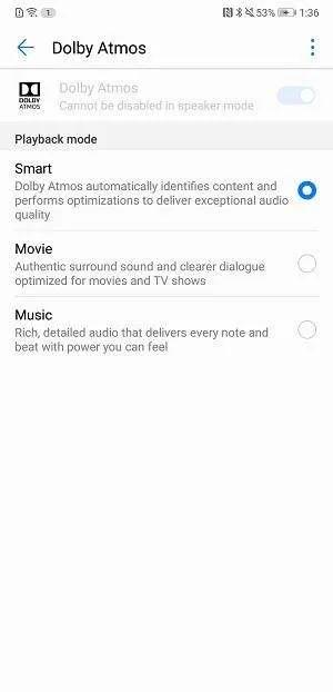 علاوه بر اینکه گوشی به دو اسپیکر مجهز شده است هوآوی با همکاری شرکت دالبی از تکنولوژی دالبی اتموس هم برای این گوشی بهره برده است. زمانی که گوشی در حالت پخش صدا توسط اسپیکر باشد نمیتوانید این ویژگی را غیرفعال کنید اما سه گزینه برایش در نظر گرفته شده است که میتوانید برای تجربه صدایی بهتر هرکدام از آنها را انتخاب کنید.