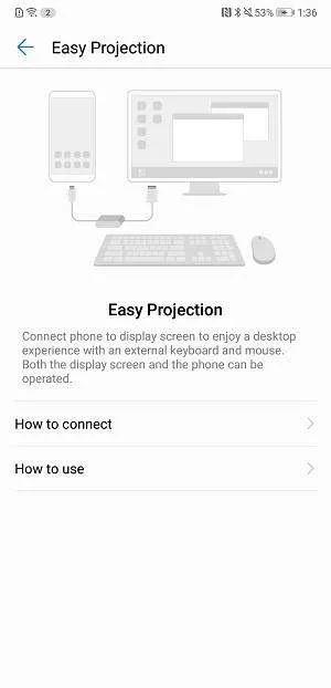 Easy Projection: در این بخش نحوه اتصال گوشی به یک صفحه بزرگتر مانند یک مانیتور بزرگ به کاربر نمایش داده میشود. برای اتصال گوشی به یک صفحه بزرگتر و استفاده از گوشی مانند یک رایانه شخصی باید یک آداپتور یا تبدیل تایپ سی به اچدی ام آی داشته باشید و با اتصال این کابلها به گوشی و به صفحه مانیتور میتوانید از این ویژگی استفاده کنید. نکته مهم در مورد این بخش این است که میتوانید از صفحهکلید و ماوس بدون سیم هم با اتصال بلوتوث به گوشی استفاده کنید.