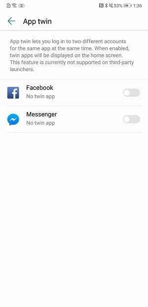 App twin: بخشی است که به شما امکان میدهد تا بتوانید دو نسخه از برخی پیامرسانها مانند مسنجر فیس بوک را روی گوشی خودتان تجربه کنید.