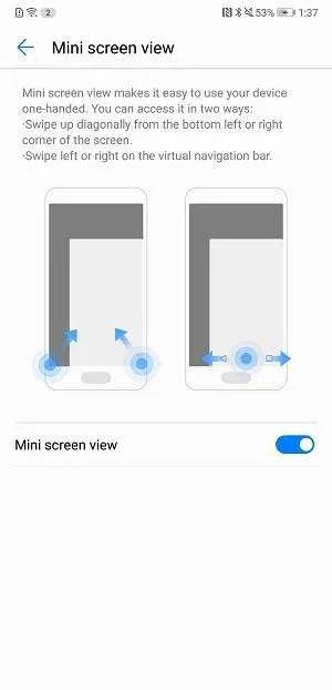 Mini Screen View: این گزینه برای زمانی است که نمیتوانید از دو دست خودتان برای کار کردن با گوشی استفاده کنید و با یک دست شما هم به بخش بالایی گوشی دسترسی ندارید؛ در این حالت میتوانید با کشیدن انگشت از یکی گوشههای پایینی گوشی به سمت داخل صفحهنمایش محتوا را در صفحهای کوچکتر مشاهده کنید. انگشت خودتان را از هر گوشهای که بکشید صفحهنمایش متمایل به آن سمت کوچک میشود.