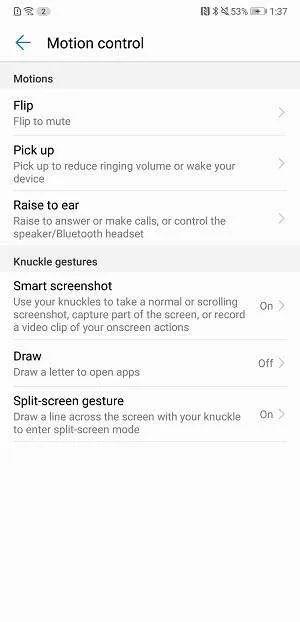 Motion Control: این بخش به شما امکان میدهد تا با برخی حرکات غیرلمسی تعامل خودتان را با گوشی بیشتر کنید. بر این اساس میتوانید با برگرداندن گوشی صدای تماسهای دریافتی، زنگها و تایمر را خاموش کنید، با برداشتن گوشی و نزدیک کردن به گوش به تماسها پاسخ دهید یا تماس بگیرید، با ضربه زدن به صفحه گوشی با پشت بند انگشت از صفحه اسکرین شات بگیرید، با کشیدن حرف خاصی روی صفحه با بند انگشت برنامه مخصوصی را باز کنید و درنهایت با کشیدن یک خط صاف روی صفحه با بند انگشت صفحهنمایش را در برنامههایی که از این ویژگی پشتیبانی میکنند به دو بخش تقسیم کنید.