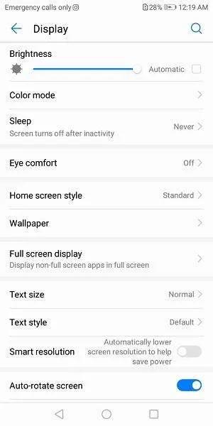 Screen resolution: این بخش در وای 7 پرایم 2018 به آن گستردگی که در گوشیهای دیگر هوآوی میبینیم نیست و فقط یک گزینه برایش در نظر گرفته شده که با فعال کردن آن گوشی به طور خودکار در مواقع ضروری به کاهش کیفیت صفحهنمایش برای مصرف کمتر باتری میپردازد.