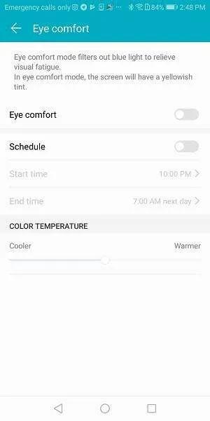 Eye Comfort: بخشی دوست داشتنی در گوشیهای پرچمدار است که راه خودش را بهخوبی به گوشیهای میان رده و حتی ارزانقیمت باز کرده است. با فعال کردن این تنظیم پیکسلهای آبی خاموش یا کمرنگ میشوند و نور زرد روی صفحه غالب میشود. این حالت برای زمانی که مشغول مشاهده صفحه نماش در محیط تاریک هستید کاربرد دارد. در این بخش میتوانید شدت نور زرد را کم و زیاد کنید یا اینکه برای فعال کردن ویژگی زمان تعیین کنید.