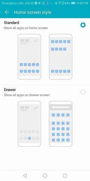 Home Screen Style: در این بخش میتوانید نوع نمایش صفحه اصلی را تعیین کنید. دو حالت در این تنظیم در نظر گرفته شده است. حالت اول، همانند نسلهای اولیه رابط کاربری اموشن یو آی، تمام برنامههای نصب شده روی گوشی در صفحه اصلی نشان داده میشوند و در حالت دوم یک صفحه جدا برای برنامههای نصب شده روی گوشی فراهم میکند که سبب میشود بتوانید از صفحه اصلی برای برنامههای پر کاربرد و ویجت ها استفاده کنید.