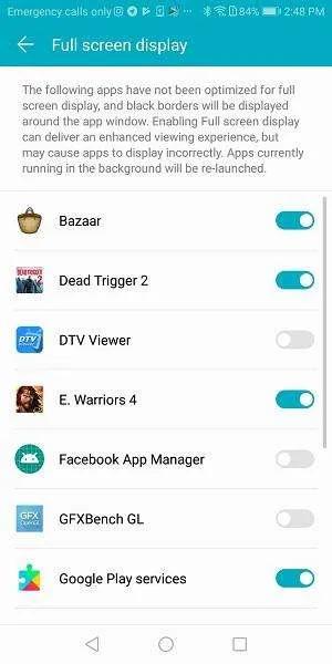 Full Screen Display: در این تنظیم برنامههایی نشان داده میشوند که با نسبت ابعاد صفحهنمایش این گوشی همخوانی ندارند و میتوانید آنها را مجبور کنید تا به صورت تمام صفحهنمایش داده شوند یا برعکس اگر پیش از این برنامههای را مجبور کردهاید تمام صفحهنمایش داده شود و از کارکردش در حالت تمام صفحه راضی نیستید آن را به حالت اول برگردانید.