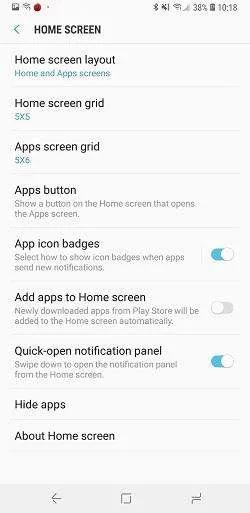 Home Screen: در این تنظیم میتوان تعداد نمایش آیکونها، نوع نمایش صفحه اصلی، نوع دسترسی به صفحه اپ دراور، تنظیم باز کردن پنل نوتیفیکیش با کشیدن انگشت روی صفحه اصلی به سمت پایین و برنامههای مخفی را مشاهده کرد.