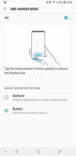 One-Handed Mode: این تنظیم کمک میکند اگر عادت دارید با یکدست با گوشی کار کنید بهراحتی بتوانید به محتوایی که در بالای صفحه است دسترسی پیدا کنید. این حالت به دو روش فعال میشود؛ در روش اول انگشت خود را از لبههای پایینی گوشی به داخل هدایت کنید و در روش دوم با 3 باز ضربه زدن روی کلید مجازی Home این گزینه فعال میشود.