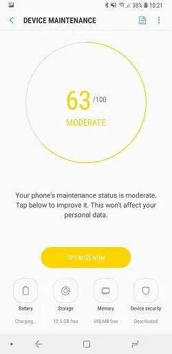 Device Maintenance: در این بخش گوشی هوشمند در 4 زمینه باتری، حافظه داخلی، حافظه رم و امنیت بررسی میشود و میزان کارایی در اختیار کاربر قرار میگیرد. اگر از میزان کارایی گوشی خودتان راضی نیستید میتوانید با لمس کلید بهینه کردن وضعیت سلامتی گوشی را بهبود دهد.