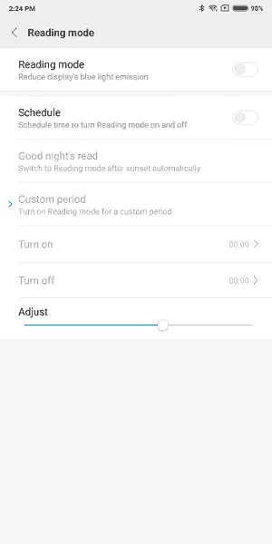 Reading Mode: با فعال کردن این تنظیم پیکسلهای آبی خاموش یا کم رنگ میشوند و نور زرد روی صفحه غالب میشود که میتوانید شدت نور زرد را با کمک شاسیای که در پایین این تنظیم قرار دارد کم یا زیاد کنید. امکان تعریف زمانبندی برای این بخش وجود دارد.