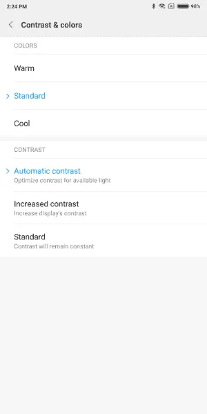 Contrast & Colors: امکان انتخاب شدت گرمای رنگها از سه حالت گرم، استاندارد و سرد وجود دارد در حالی که میتوانید کنتراست را هم از بین سه حالت خودکار، افزایش یافته و استاندارد انتخاب کنید.